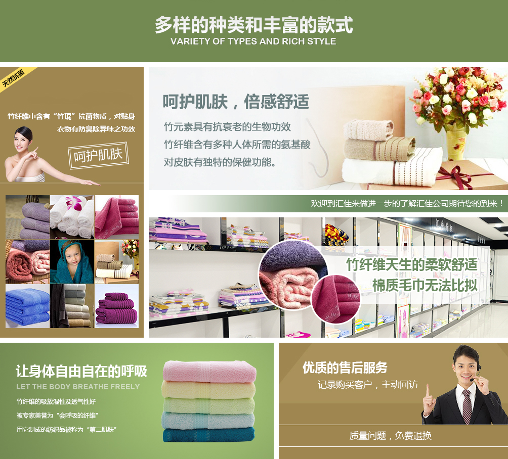 德州匯佳紡織品有限公司專業(yè)生產竹纖維毛巾,是竹纖維毛巾品牌廠家,并且提供竹纖維毛巾禮盒套裝用于福利和禮品。公司座落于山東德州,交通十分便利,公司近臨京滬高速公路,距離德州火車站、汽車站10公里京滬高鐵5公里,濟南國際機場120公里。